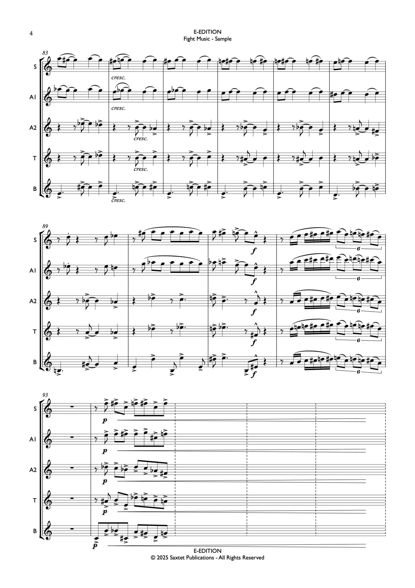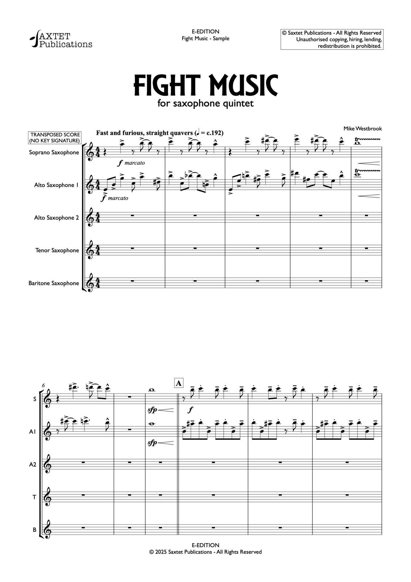 Fight Music was originally written for the iconic 1994 opera Coming Through Slaughter, (the overture from this opera is also available through Saxtet Publications). The opera is based on Michael Ondaatje’s novel about the life of the New Orleans cornettist Buddy Bolden.